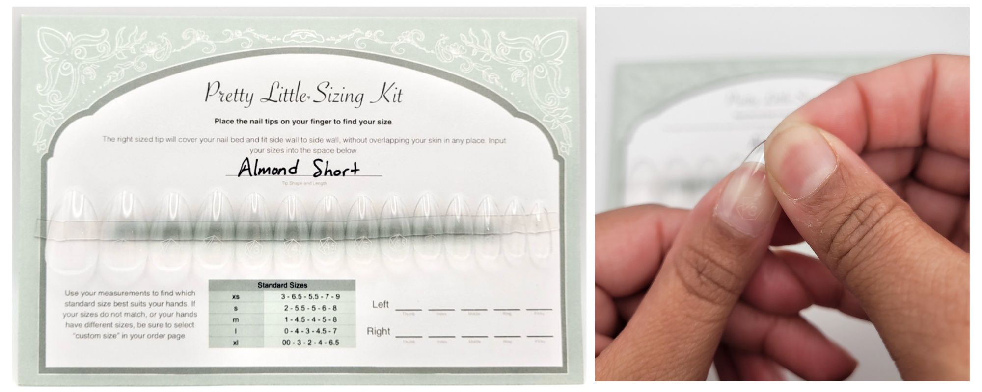 Sizing kits help ensure your custom-ordered nails fit perfectly. When you purchase a sizing kit, you’ll receive one nail in each size for the selected shape and length. This allows you to try on different sizes to find the best match for each of your fingers, taking the guess work out of ensuring a flawless fit for your custom set.